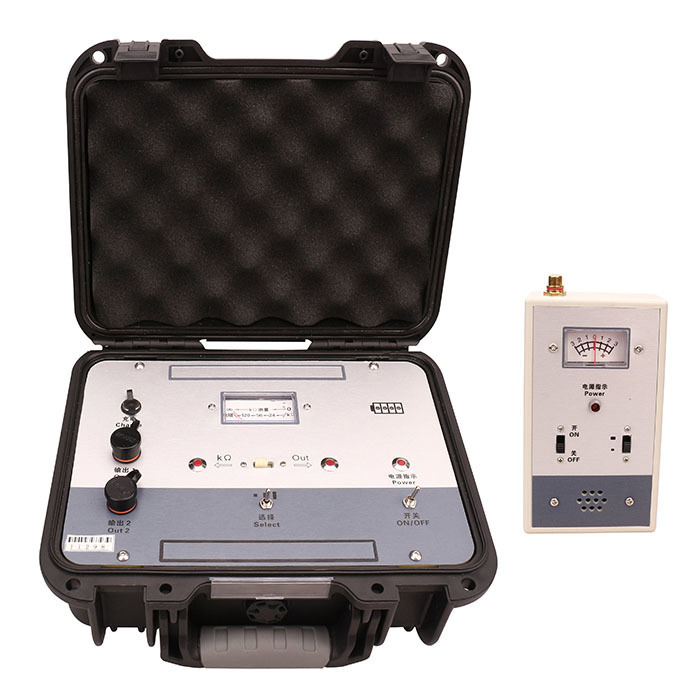 The transmitter panel is equipped with "power switch", "power indication"; "output selection", "high, medium, low"; "output indication" and "K measurement" switching switches, and the indicator light indicates the switching position; "output·KΩ measurement" shares an output terminal, which is switched by the "output·indication" and "KΩ measurement" switches; set "output 2" output terminal; square meter head indicates output and KΩ resistance. It can check the line on, off, mixed, and measure the size of the ground leakage resistance.